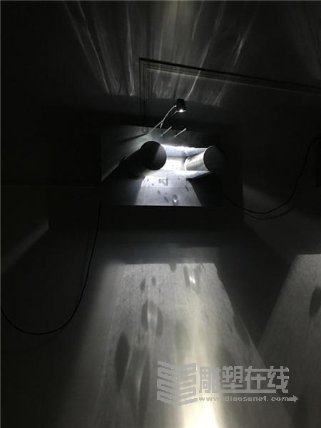 创作的灵感来源是磁带,磁带曾经被广泛应用于各种信息的记录,同时它也承载着很多人的回忆,其中记录的信息会通过磁带的旋转来传达,在此,作者利用水的清透性和流动性,将水与其结合,当水滴滴在不停转动的带子上时,其不可预知的形状会通过灯光投射到墙面上,随机留下的影子就像是记录在其中的一段回忆、一段故事的缩影,也象征着不可预知的明天。当带子转到尽头时,水滴便会滴落在地上,其影子也会消失不见,这时又会有新的水滴滴落在带子上形成随机的影子,又如一段崭新的开始,如此反复。